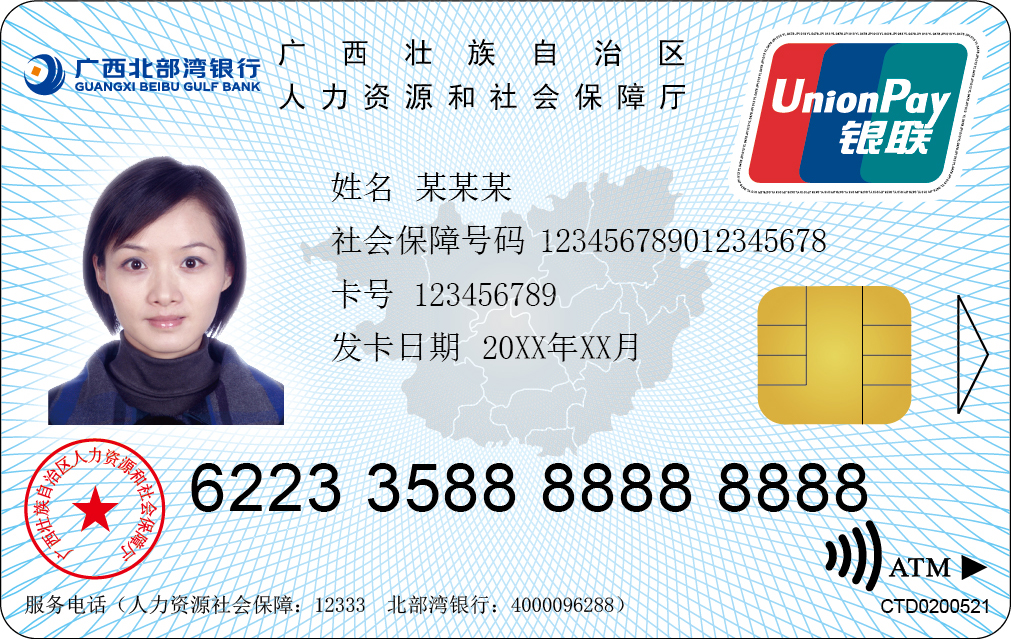 广西北部湾银行社保卡是我行与广西壮族自治区人力资源和社会保障厅联合发行,集金融功能和社保功能于一体的借记IC卡产品,该卡是广西区内参保人享受养老保险、医疗保险、失业保险、工伤保险、生育保险等社会保障待遇的身份凭证,记载了参保人基本信息和各类社会保障信息。同时,该卡具备我行借记卡的全部金融功能,收费标准与我行贵宾卡一致,享受我行专属客群活动和权益。