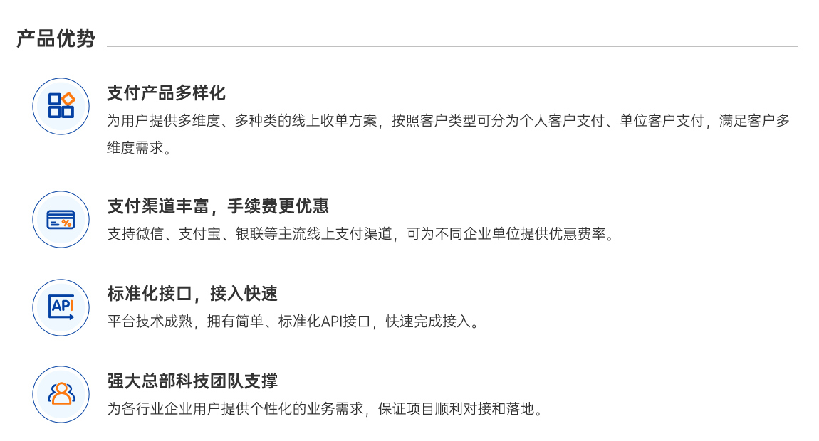 可为供应链企业、政府、医院和学校等对公单位用户的线上平台提供多样化的线上支付结算综合服务方案。
